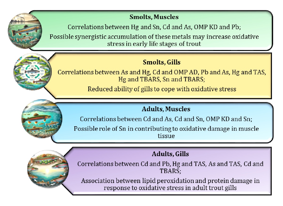 Fourthly, our regression analysis indicates that several factors (developmental stage, tissue type and their interactions) significantly affect the levels of chemical elements such as Cd, Pb, As, Hg and Sn as well as oxidative stress biomarkers in trout, as shown in Table 2, underlining the critical role of these factors in determining the concentration of these elements in fish, particularly in response to environmental conditions. We would like to emphasise that the smolt gill data revealed several strong correlations that underline the complex relationships between metal accumulation and oxidative stress, as shown in Table 3. Sn was significantly correlated with both TBARS and OMP AD, highlighting its role in promoting oxidative damage in smolt gills. The strong positive correlations between oxidative stress indicators such as TBARS and OMP AD further support the concept of integrated oxidative damage in response to metal accumulation. Fig. 9 summarises the key findings of our study and illustrates the impact of chemical element contamination on trout health, with a focus on oxidative damage.