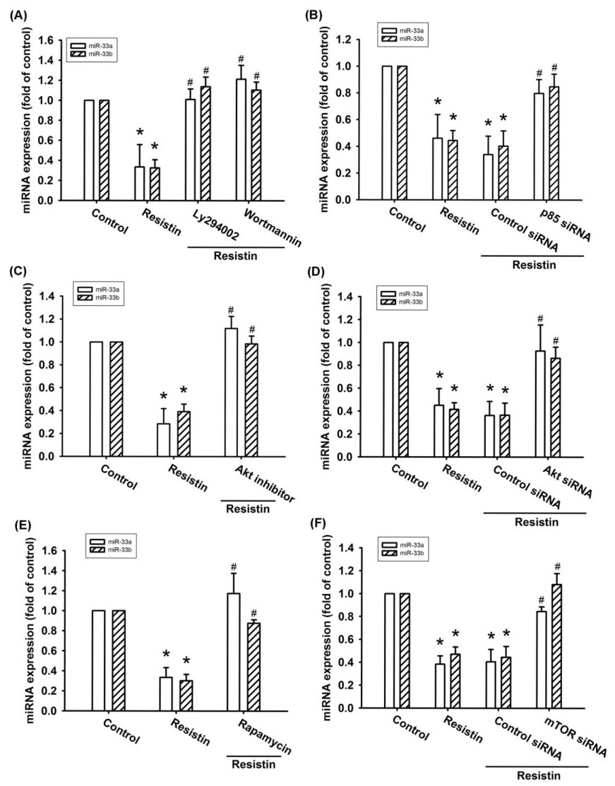 Recombinant human resistin was purchased from R&D Systems (Minneapolis, MN, USA). We purchased p85, Akt and mTOR primary antibodies (Santa Cruz Biotechnology, CA, USA), as well as rabbit polyclonal antibodies specific for p-p85, p-Akt and p-mTOR (Cell Signaling Technology, Danvers, MA, USA). miR-33a and miR-33b mimics, miRNA control, Lipofectamine 2000, and Trizol were purchased from Life Technologies (Carlsbad, CA, USA). Dharmacon Research (Lafayette, CO, USA) supplied ON-TARGETplus™ siRNAs. Gibco-BRL life technologies (Grand Island, NY, USA) supplied fetal bovine serum (FBS), RPMI-1640, α-MEM, and all other cell culture reagents. All other chemicals or inhibitors were purchased from Sigma-Aldrich (St. Louis, MO, USA).