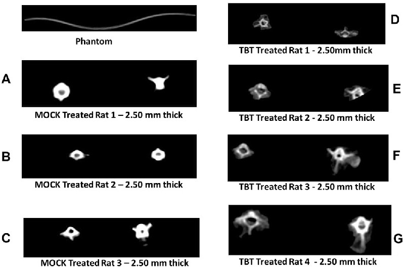 MicroCT of the spine (lumbar) bones from rats treated with 100 ng/kg TBT and controls were done at the Universidade Estadual do Norte Fluminense Darcy Ribeiro (UENF), Campos dos Goytacazes-RJ, Brazil. The samples were placed in the scanner in sternal recumbence, and the tomographic images were rebuilt using a GE Health Care multiplying computed tomography (CT) scanner (model 2290468, GE Inc., USA); images were handled using OsiriX software.