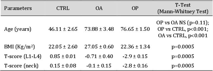 Bone mineral density evaluation (DXA) was performed with a Lunar DXA apparatus (GE Healthcare, Madison, WI, USA). Lumbar spine (L1-L4) and femoral (neck and total) scans were performed, and bone mineral density (BMD) was measured according to manufacture recommendations [26]. Dual-energy X-ray absorptiometry measures BMD (in grams per square centimeter), with a coefficient of variation of 0.7%. For patients with cervical femoral fragility fracture, BMD was measured on the limb opposite to the fracture side. Instead, for the other patients, all measurements were performed on the nondominant side, while participants lay supine on an examination table with their limbs abducted away from the trunk [27]. DXA exam was performed 1 day before surgery for OA patients, and 1 month after surgery for OP and CTRL patients. The results were expressed as T-scores.