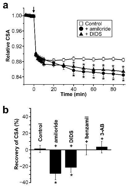 The ability of cell volume regulation is fundamental to the survival and function of animal cells under not only physiological conditions but also pathological situations [1-4, 31, 63, 64]. The volume regulation processes are classified into RVD and RVI, that take place after cell swelling and shrinkage, respectively, and they are essentially involved not only in the relief of osmotic volume perturbation but also in cell shape changes associated with cell proliferation or mitosis, differentiation and migration [2, 55, 65, 66]. Persistent cell swelling and shrinkage lead to induction of necrotic and apoptotic cell death, respectively [4, 67]. On the other hand, rat SON MNCs were reported to exhibit sustained cell swelling and shrinkage in response to hypoosmotic and hyperosmotic stimulation, respectively, without showing discernible cell volume regulation [6]. However, we demonstrated that AVP neurons identified by transgenic eGFP expression can respond to a hypoosmotic challenge with a slow RVD event which is attained by activation of volume-sensitive outwardly rectifying anion channels (VSORs) by osmotic cell swelling and AVP receptor-mediated autocrine signaling [7]. In the present study, eGFP-identified AVP neurons were found to respond with sustained cell shrinkage to a hyperosmotic challenge without apparently showing volume recovery (Fig. 1a). However, when FFA was added to a hyperosmotic solution, a typical RVI event became evident after osmotic cell shrinkage in the AVP neurons (Fig. 3a). The RVI event observed in the presence of FFA was completely eliminated by application of amiloride and DIDS (Fig. 3a, c) that are blockers of NHE and AE, respectively. In contrast, as shown in Fig. 1b, changes in the CSA values of AVP neurons after exposure to a hyperosmotic solution were affected neither by benzamil, which is known to block ENaC much more strongly than amiloride [34], nor by 3-AB, which is known to block PARP [35] and thereby suppress PARP-dependent TRPM2 channel activity [36]. Thus, NHE and AE are likely involved in the RVI process in the presence of FFA in AVP neurons. Taken together, it appears that rat AVP neurons do possess the RVI ability which is largely attained by parallel operation of NHE and AE, and that the RVI event is hidden behind some additional cell shrinkage process which is sensitive to FFA.