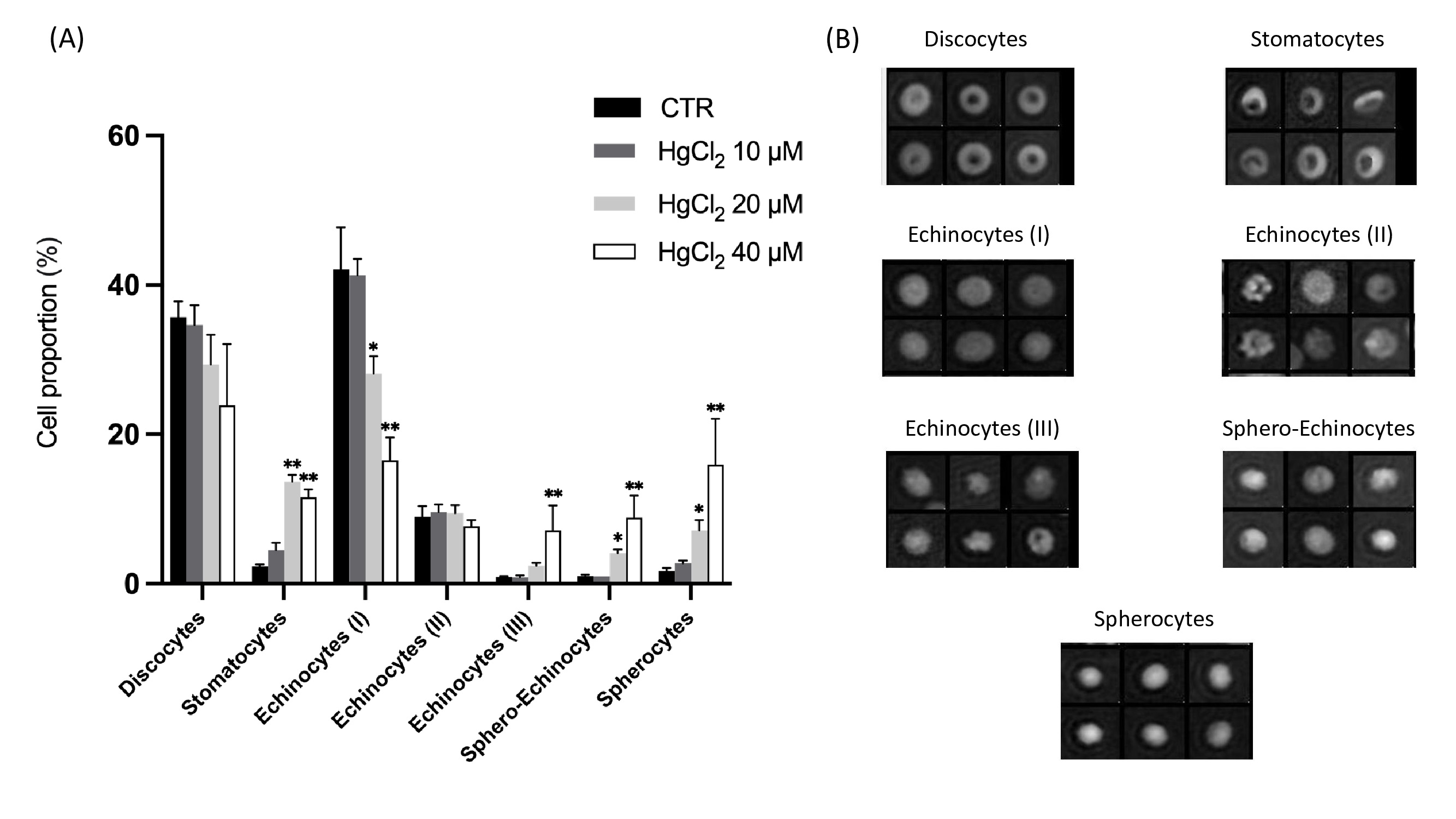 As a global trend after 24 h of incubation, the addition of HgCl2 induced decreases of discocytes from 35 (CTR) to 24% (HgCl2 40 μM) and echinocytes (I) from 42 to 16.5% and concomitant increases of echinocytes (III) from 0.9 to 7.1%, sphero-echinocytes from 1 to 8.9% and spherocytes from 1.7 to 16%; as for the echinocytes (II) no difference was observed between all conditions. It highlights a clear shift from reversible to irreversible morphologies. Moreover, the 10 μM had a moderate effect, whereas the addition of 40 μM of HgCl2 significantly affected the RBC.