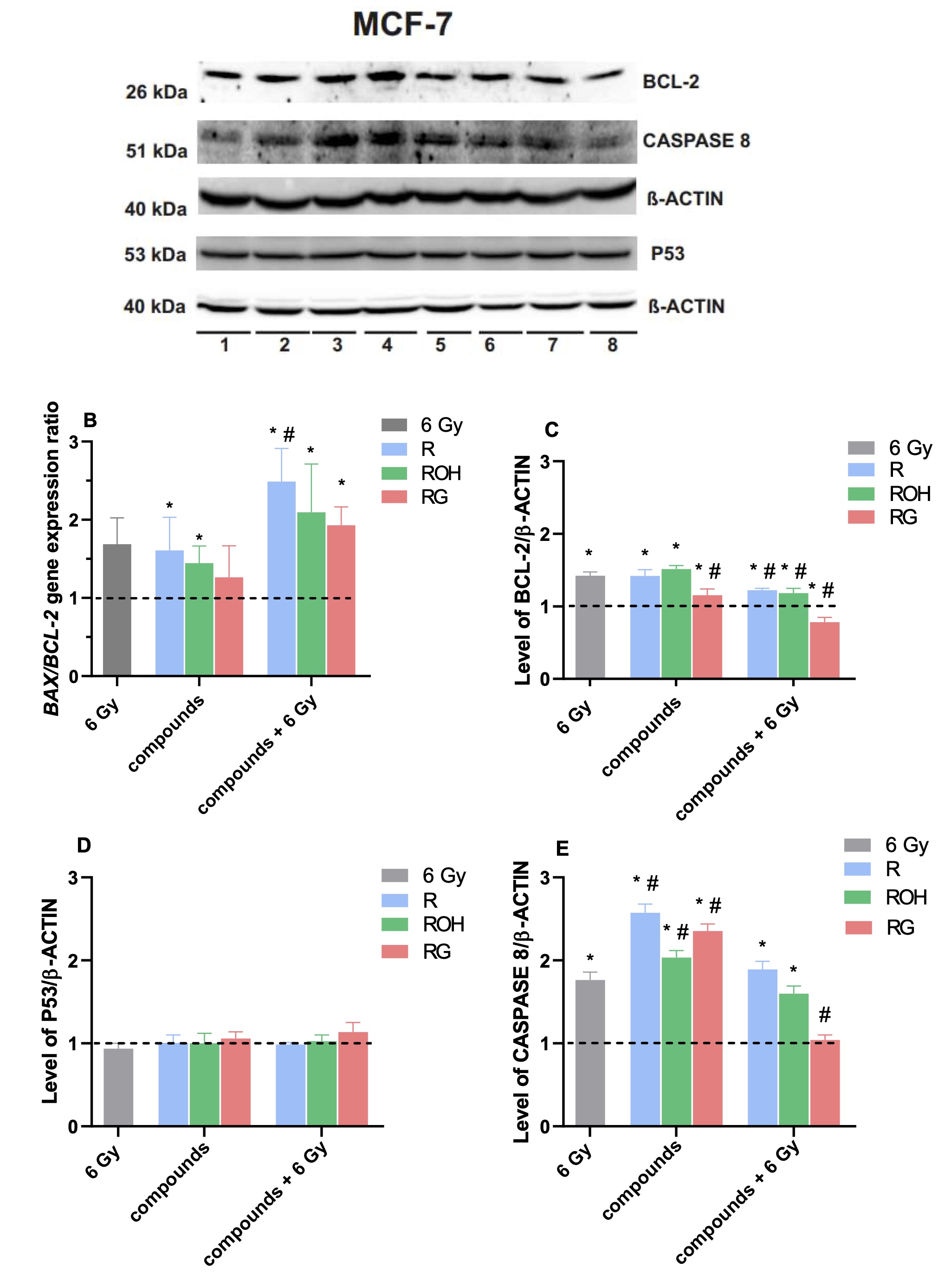 Fig. 3: Expression level of selected genes and proteins involved in the apoptosis process in MCF7 cells: (A) representative image of western blotting results obtained in this study, lines: (1) – control cells, (2) – cells irradiated with 6 Gy, next cells treated with: (3) – resveratrol, (4) – piceatannol, (5) – polydatin, and (7) – resveratrol and 6 Gy, (8) – piceatannol and 6Gy, (9) – polydatin and 6 Gy. (B) the BAX/BCL2 gene expression level ratio assessed based on the real-time PCR method—own data, adapted from [26]. Relative level of proteins identification by Western blot method: (C) BCL-2 protein, (D) P53 protein, and (E) CASPASE 8 in MCF7 cells treated with 25 μM of resveratrol (R), piceatannol (ROH), and polydatin (RG) alone and in combination with IR (dose of 6 Gy). The results obtained in each kind of sample were compared to controls, i.e., cells not treated with any of the tested factors. The mean difference (*) was compared with the control and (#) with IR.