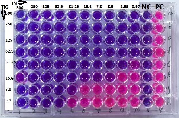 Fig. 1: Checkerboard assay results for the MIC determination of Indolicidin and Tigecycline in MDR A. baumannii isolates. NC: negative control (NC), PC: positive control (PC).
