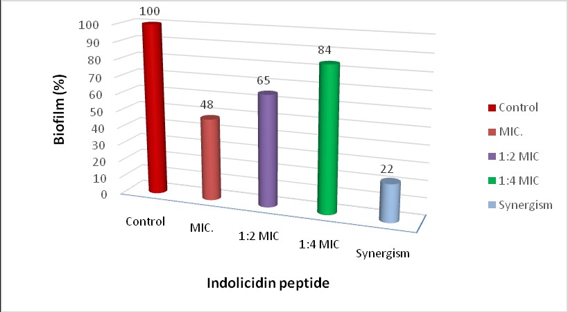 Fig. 2: Anti-biofilm activity using different concentrations) of Indolicidin peptide (1 MIC, 1/2 MIC, 1/4 MIC, and synergism with Tigecycline (0.97+15.6 µg/ml) by crystal-violet assay against A4 isolate of A. baumannii.